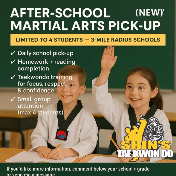 We are opening a small after-school Taekwondo program where students are picked up after school, complete their homework, and train in a structured, positive environment.