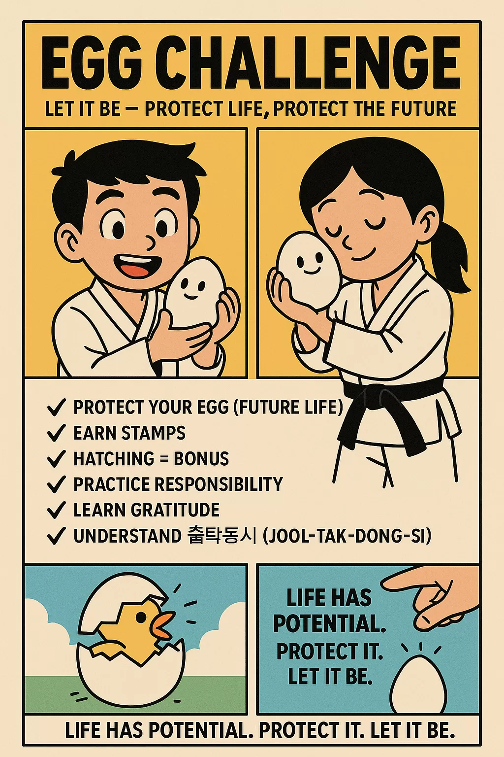 If the egg remains safe through the challenge, students earn stamps. If the egg hatches, they receive bonus recognition. The winner receives a Taekwondo uniform — but more importantly, every participant gains something deeper.